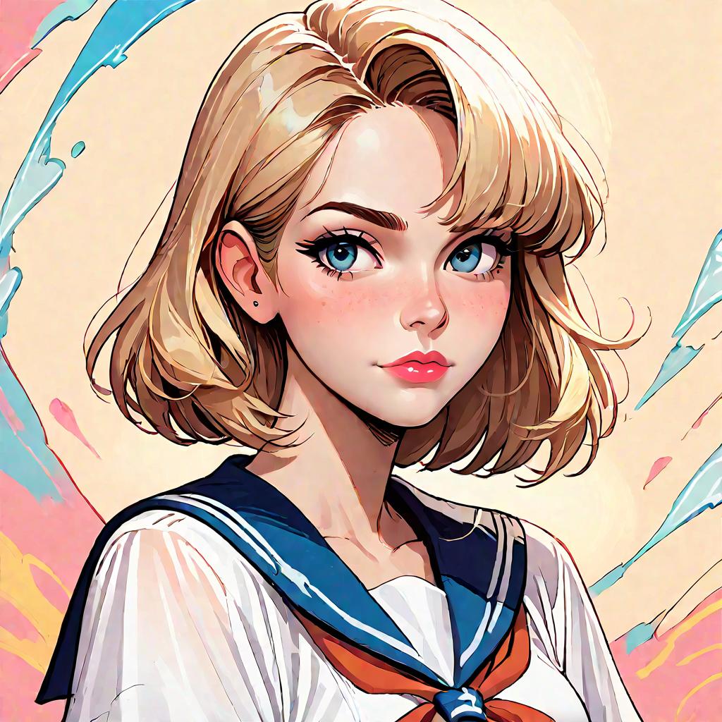 Digital anime-style portrait of a blonde woman with blue eyes, wearing a red vest, against a vibrant blue sky with white and red brushstroke accents.
