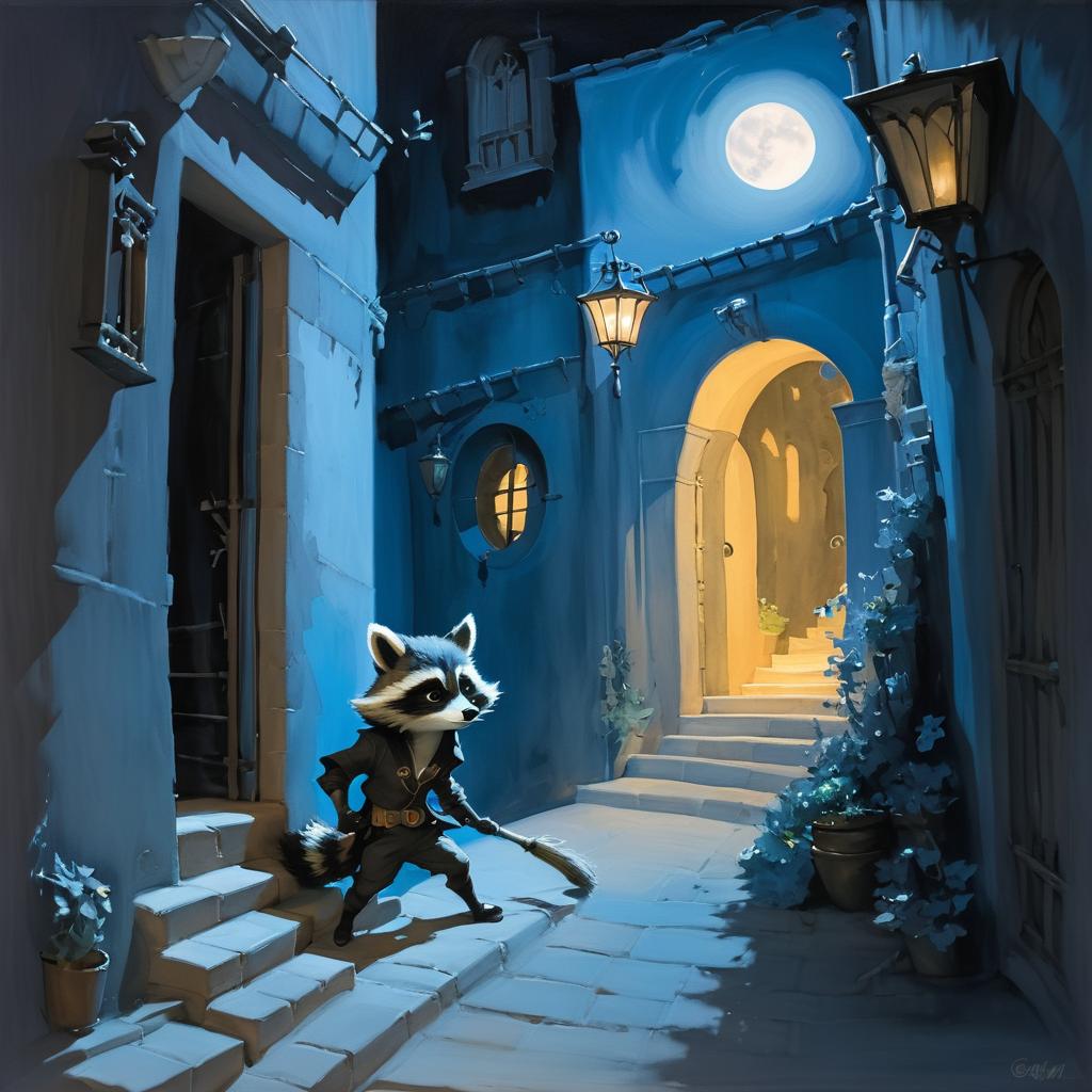 Oil painting of a sly raccoon thief sneaking through a moonlit alley, by Claire Wendling, fantasy style.