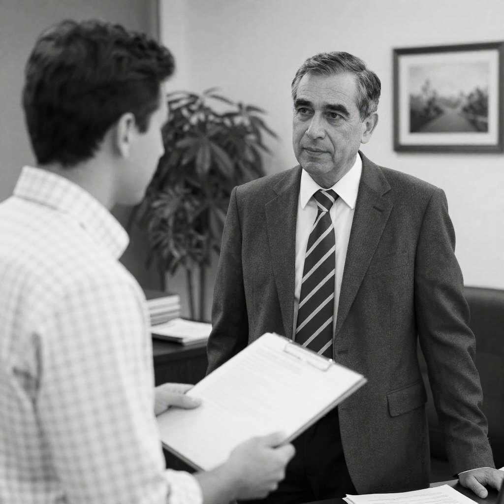 Black and white photograph of three people. Foreground: two men in suits, one older with gray hair, one younger with dark hair, both looking down at a piece of paper. Background: woman with short hair, serious expression, standing slightly behind. Indoor setting with industrial elements.