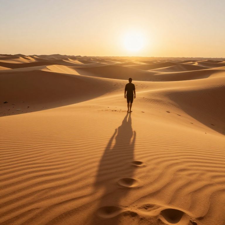 Photograph of a solitary figure walking in a vast desert at sunset. The person, silhouetted against the glowing sun, casts a long shadow on rippled orange sand. The desert's undulating dunes stretch into the horizon, with the sun low in the sky, casting a warm, golden light. The sand's texture is clearly visible, with gentle ripples and footprints leading to the center. The sky is clear, transitioning from a bright yellow near the sun to a deeper orange above. The scene evokes a sense of solitude and tranquility.