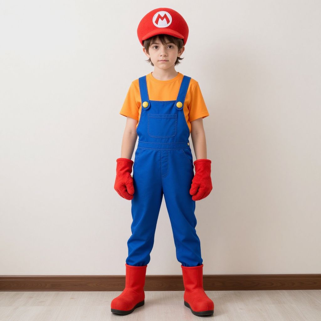 "daisy super mario costume, 1boy, male focus, solo, gloves, hat, overalls, cosplay, full body, red gloves, red footwear, boots, standing Realistic photo of casual sexy person with pretty face"
