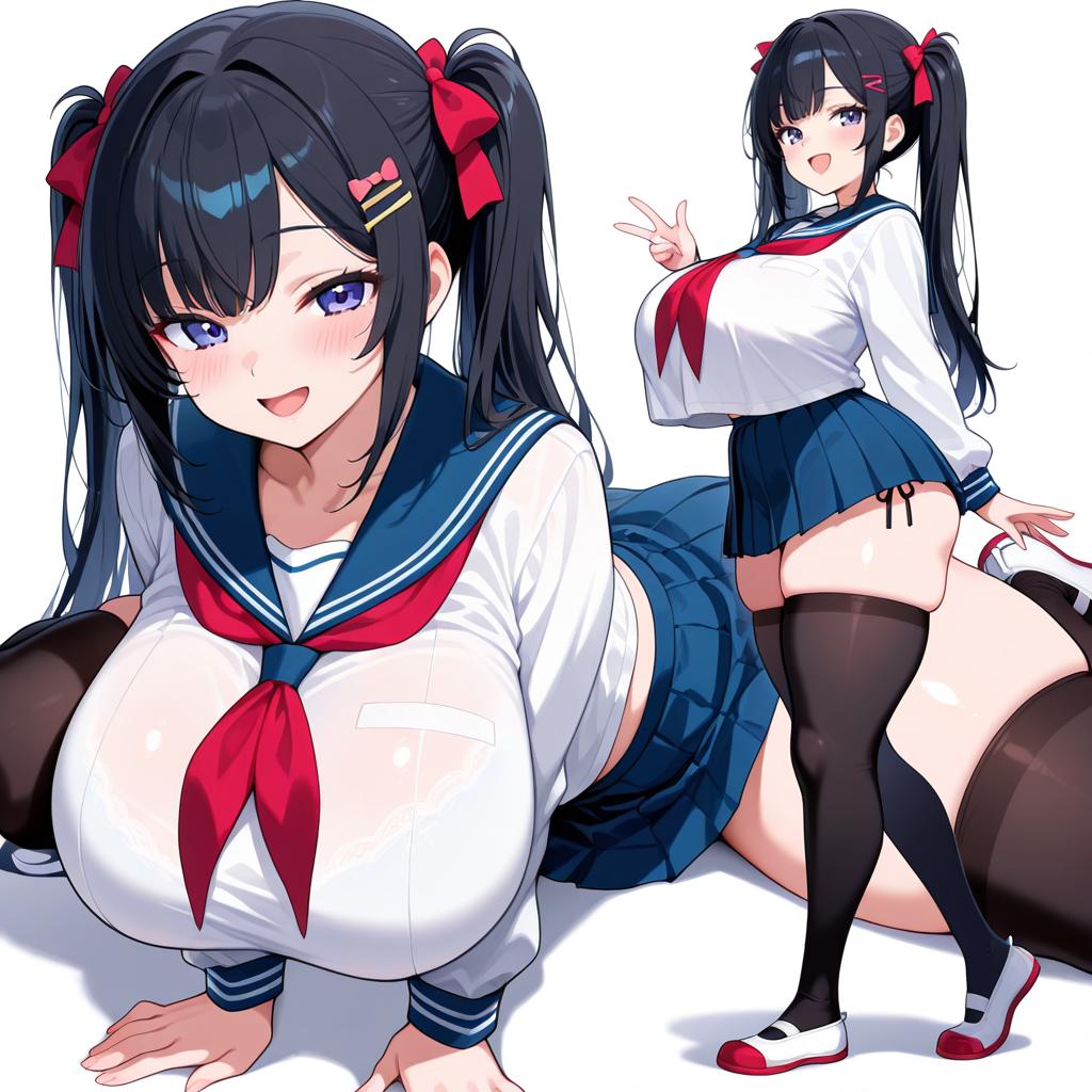 Digital illustration of an anime-style young woman with long black twin-tailed hair adorned with red bows and hairclips. She is wearing a traditional Japanese schoolgirl sailor uniform featuring a white blouse with a red neckerchief, a blue pleated skirt, and black thigh-high stockings. The character poses confidently with a smile, showcasing thick thighs, a mole under her eye, and side-tie peek underwear. The background is plain white, emphasizing the character's vibrant colors and detailed shading.