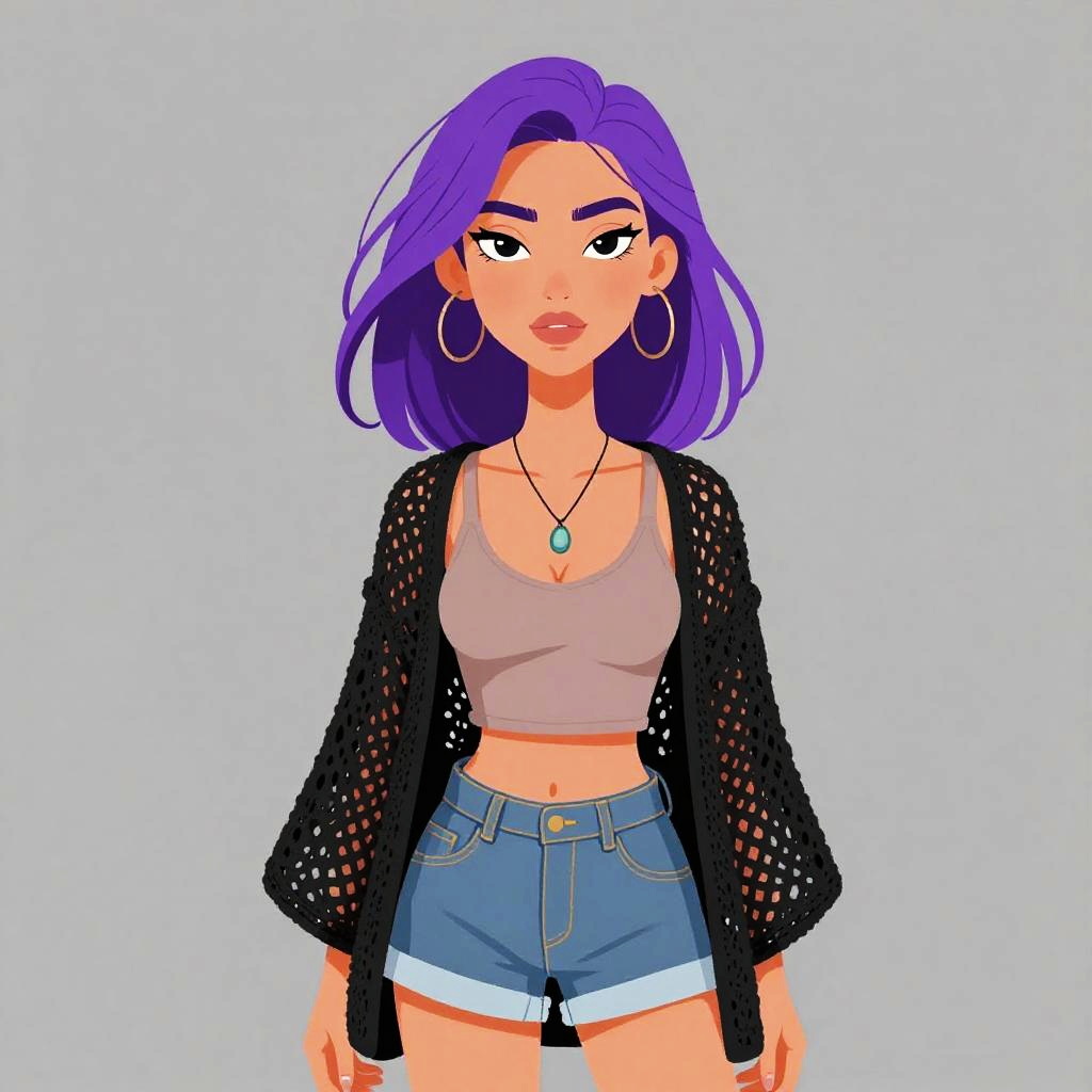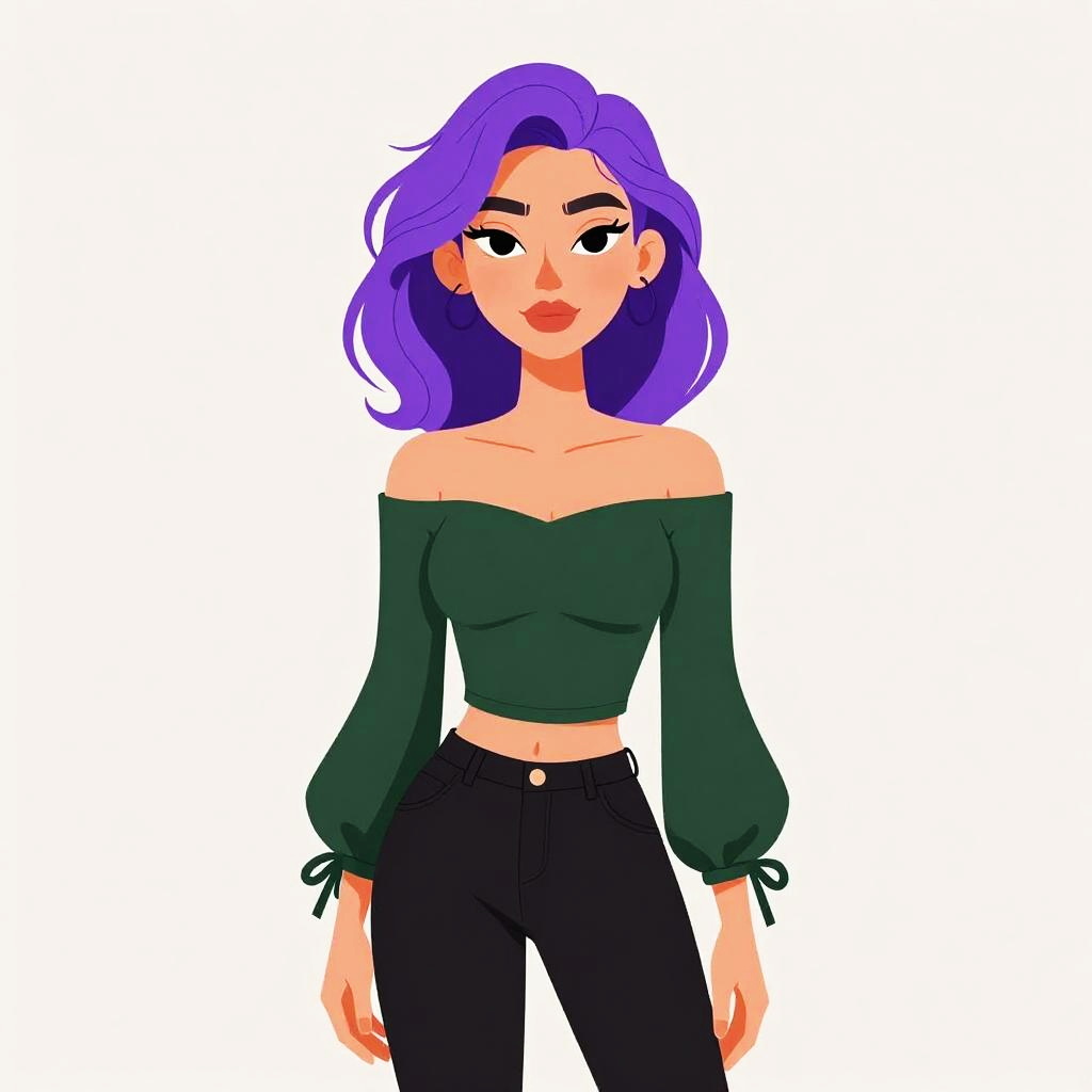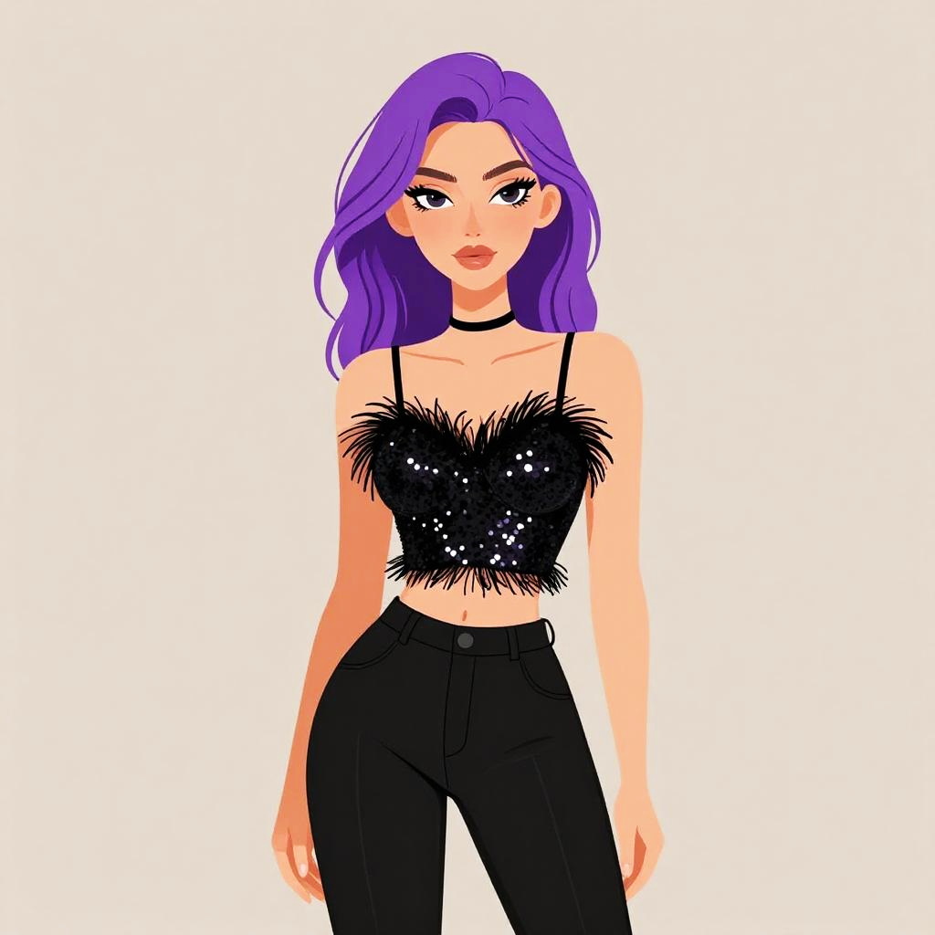 Woman with pretty face and pretty hair. Woman, contemporary party look, black iridescent sequined crop top with feather trim, straight neckline, spaghetti straps, paired with high-waisted black trousers, slim fit, neutral makeup, choker necklace, photo studio background with a beige hue. --sref 1467