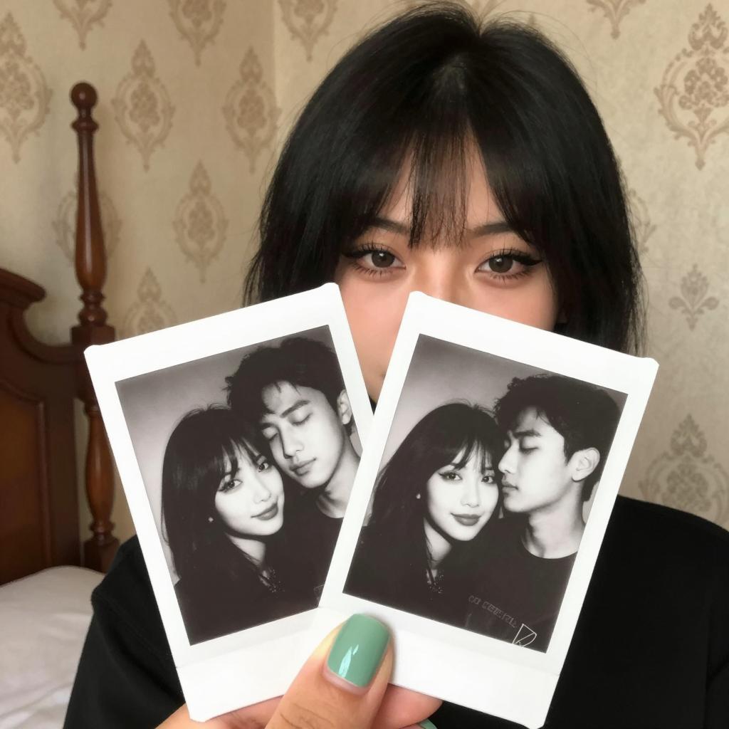 Woman with short black hair and heavy eyeliner, holding two black-and-white photos of herself with a man. Her eyes are visible over the top edge of the photos. Her right hand has green-painted nails. Patterned wallpaper in the background. Wooden bedpost to the left. Photos show her in an embrace with the man, both with closed eyes.