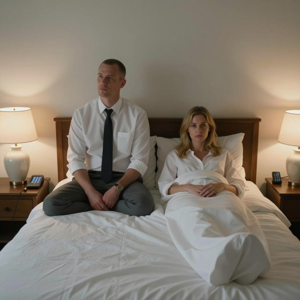A bedroom with a large bed in the center. A man with blonde hair, wearing a gray suit, leans over the bed, holding a clipboard and pen. A woman with short blonde hair, wearing a light-colored sweater, sits on the left side of the bed, facing the man. Two lamps with beige shades are on either side of the bed, casting warm light. The bed has a white, patterned comforter and a single pillow. A brown bag is on the floor in front of the bed. The man and woman are engaged in conversation, both looking at each other.