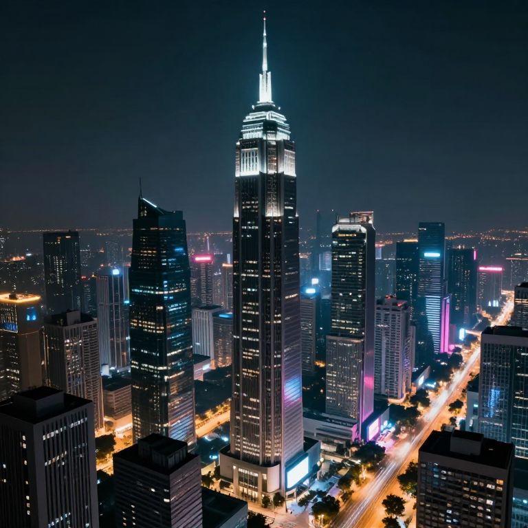 Nighttime photograph of a city skyline, prominently featuring a brightly lit skyscraper with a spire, surrounded by illuminated buildings and neon lights.