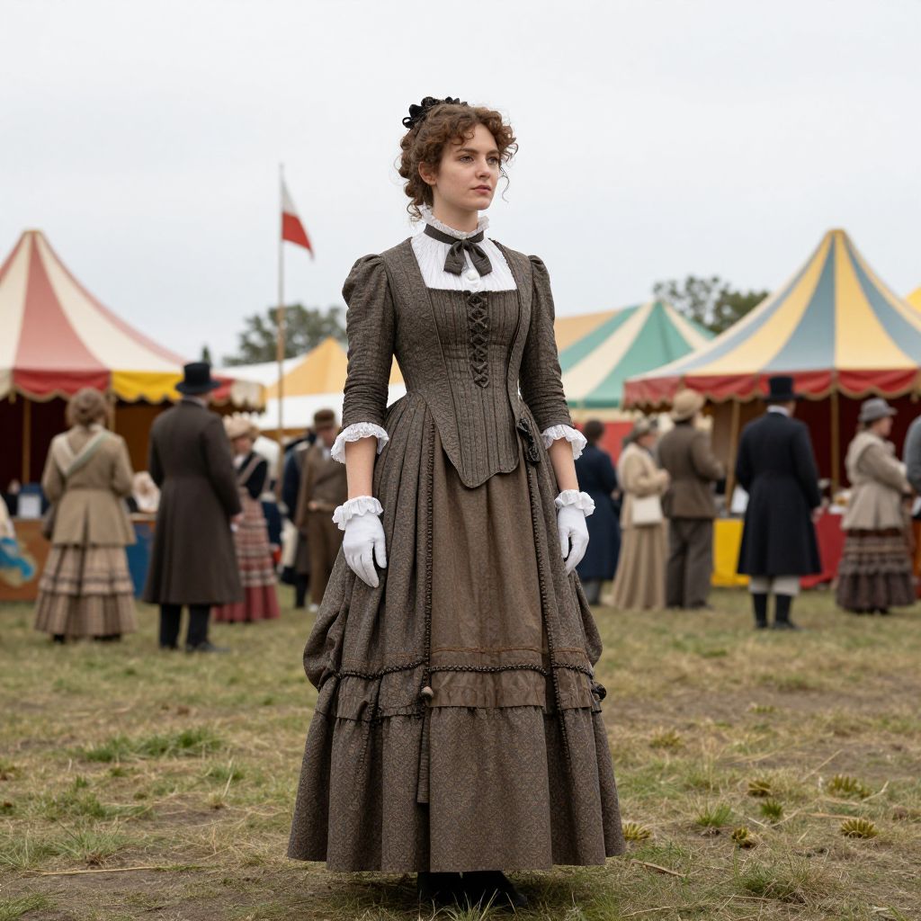 A woman in a Victorian-era dress stands in a bustling 19th-century carnival, surrounded by people and colorful tents.