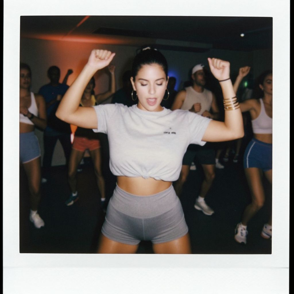 A woman, in a sporty casual outfit with a cropped heather grey T-shirt and high-waisted shorts, wearing gold hoop earrings and bangle bracelets, is enjoying an evening fitness dance party, captured in a polaroid instant camera style as she dances energetically under colorful lights. Sexy. Pretty face and beаutiful eyes. Big breasts