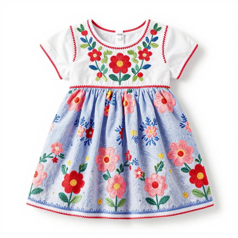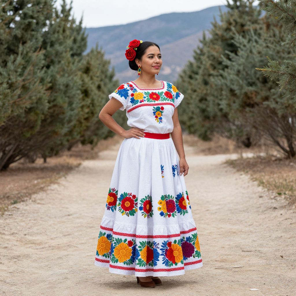 Vibrant tomato-red Mexican peasant blouse featuring intricate Fiesta-themed embroidery with colorful floral patterns, ruffled sleeves, and a pleated bodice.