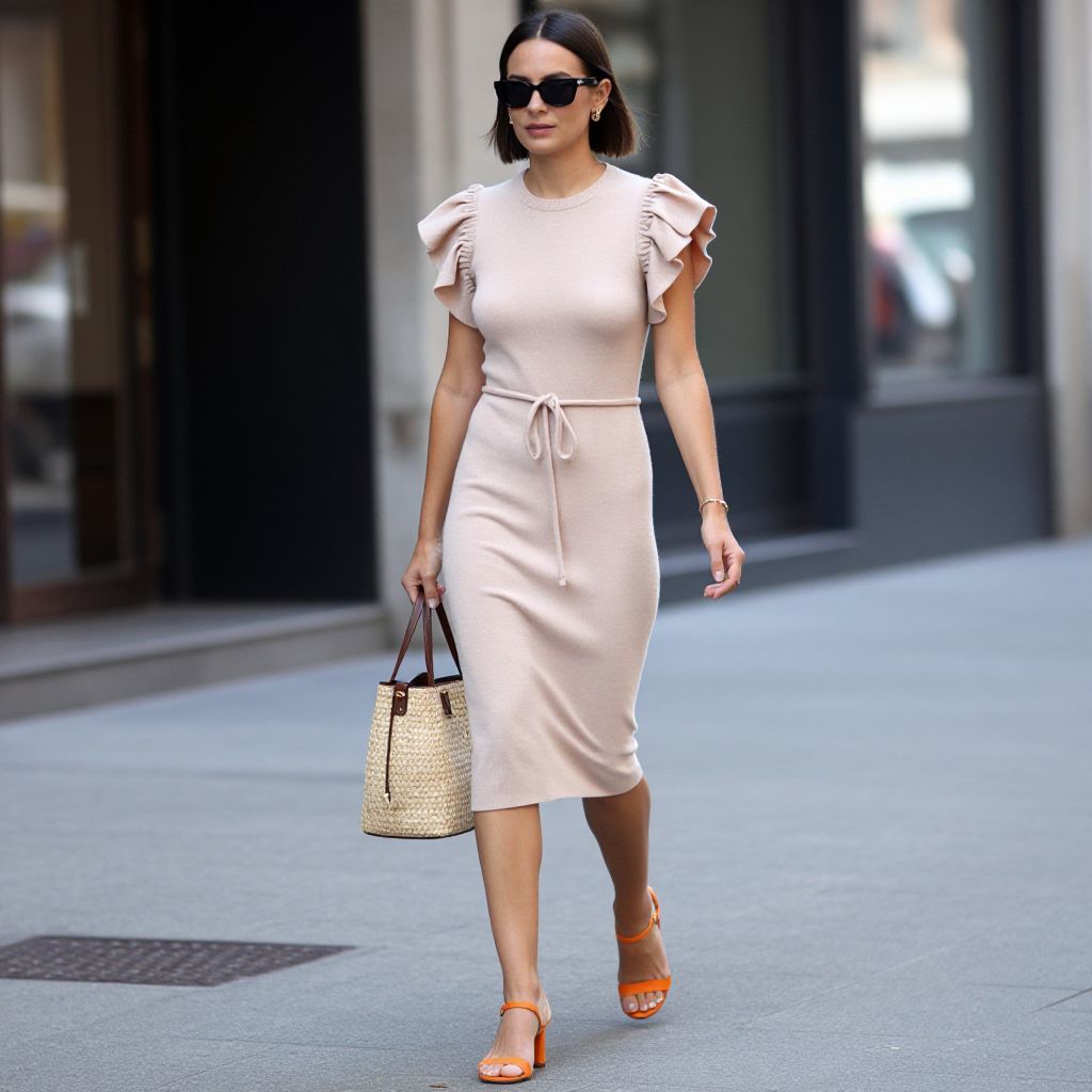 Stylishly dressed woman walking down a city street, wearing a blush-colored knit dress with ruffled sleeves, a drawstring waist, and carrying a woven bucket bag, complemented by orange heeled sandals and sunglasses.