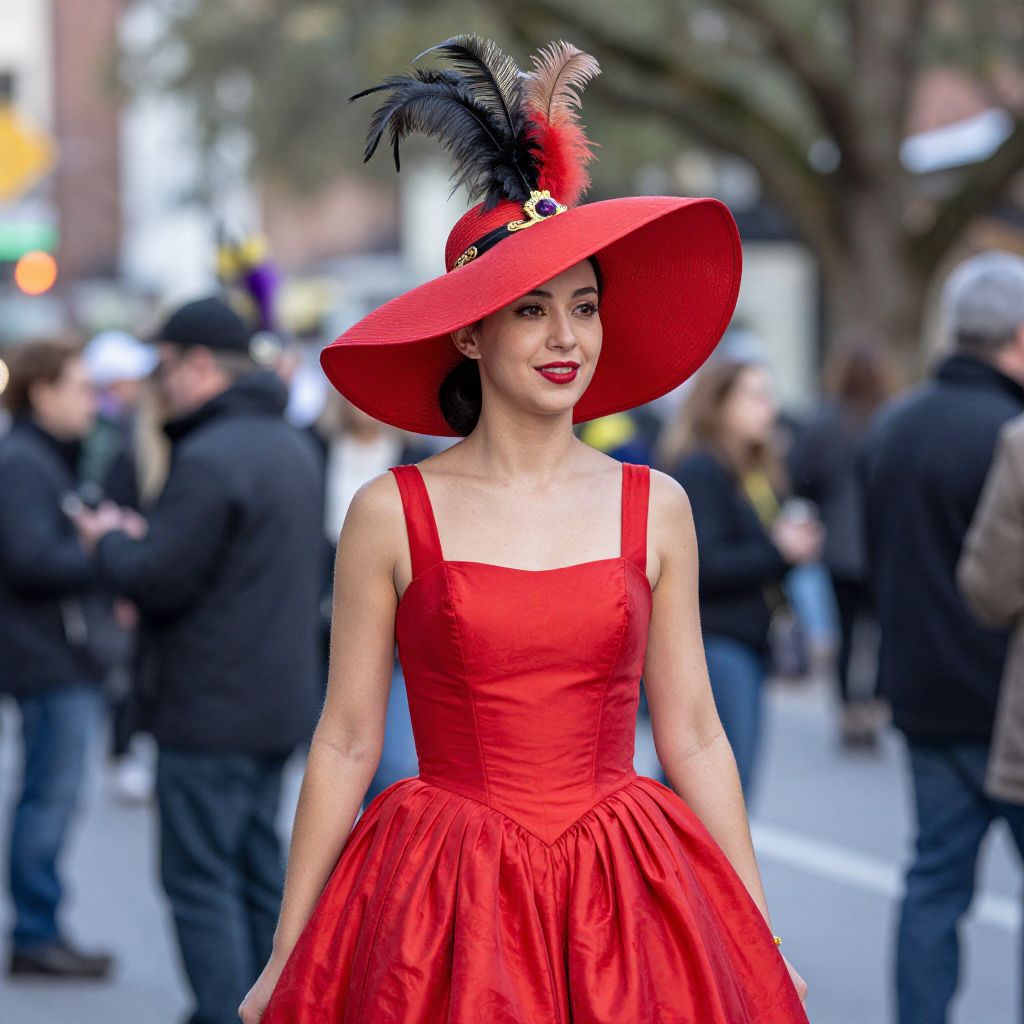 Red Mardi Gras Dress, woman wearing a red dress and a large hat with feathers