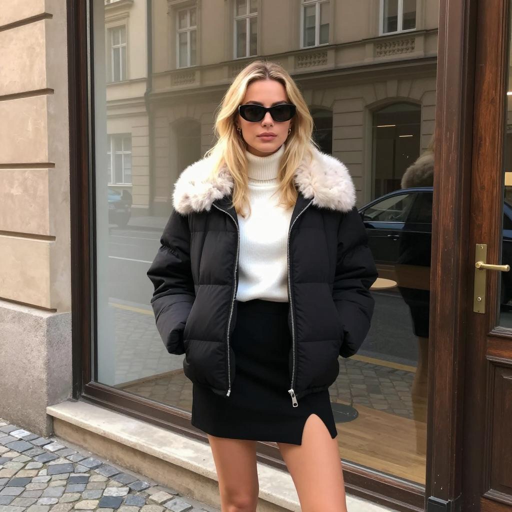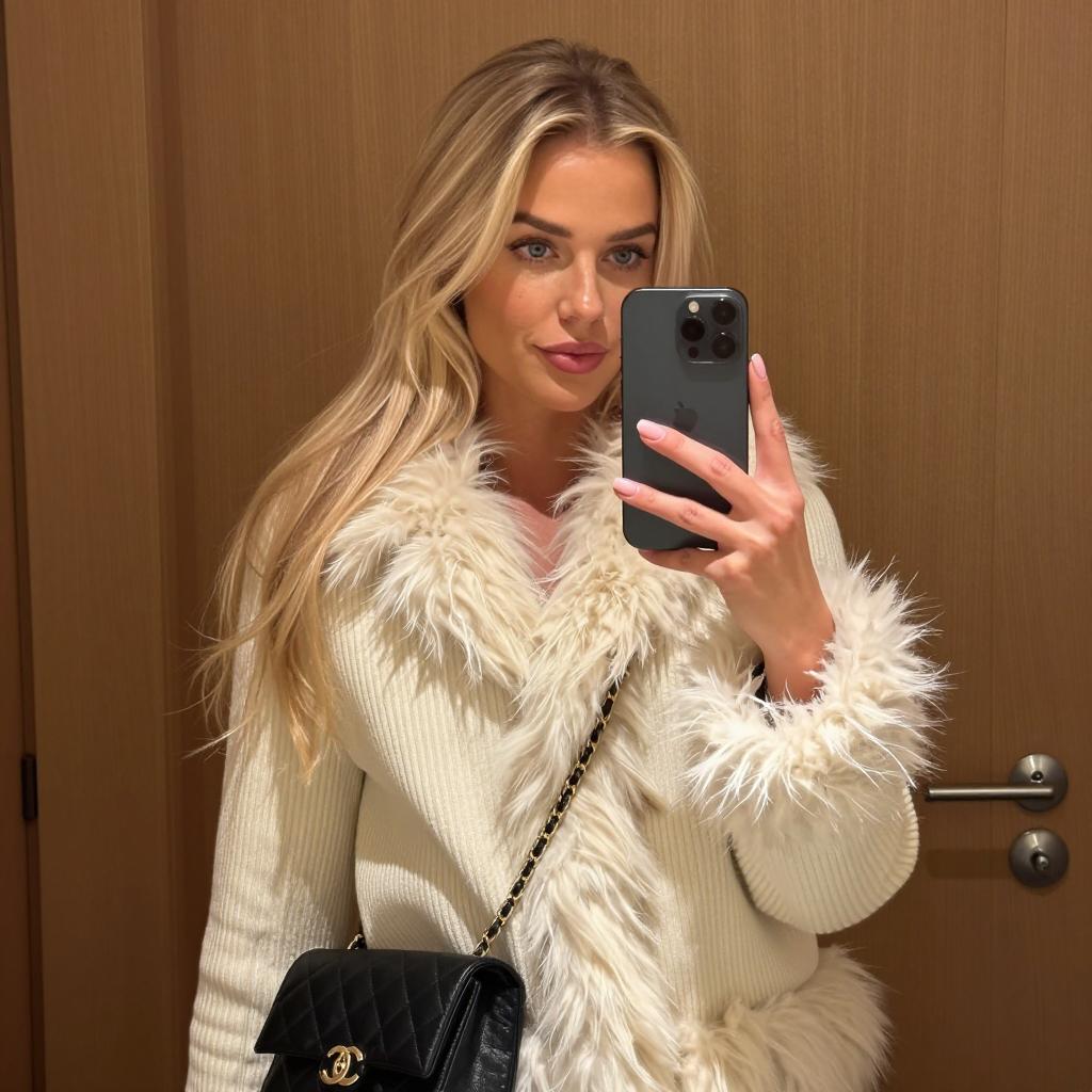 Woman squatting outdoors, taking a selfie in a window. She wears a black hoodie, white pants, white lace-up boots, and a white beanie. She has long blonde hair, dark sunglasses, and a leopard-print phone case. She holds a black chain purse. Snow falls on her. Background includes trees, a building, and a cobblestone street. Mirror reflection shows her squatting pose.