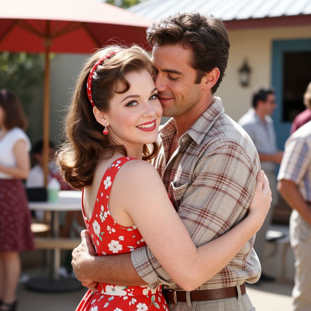 Two characters from *Grease* embrace warmly in a vibrant outdoor setting, with the woman in a red floral dress and the man in a plaid shirt, both exuding classic 1950s style and charm.