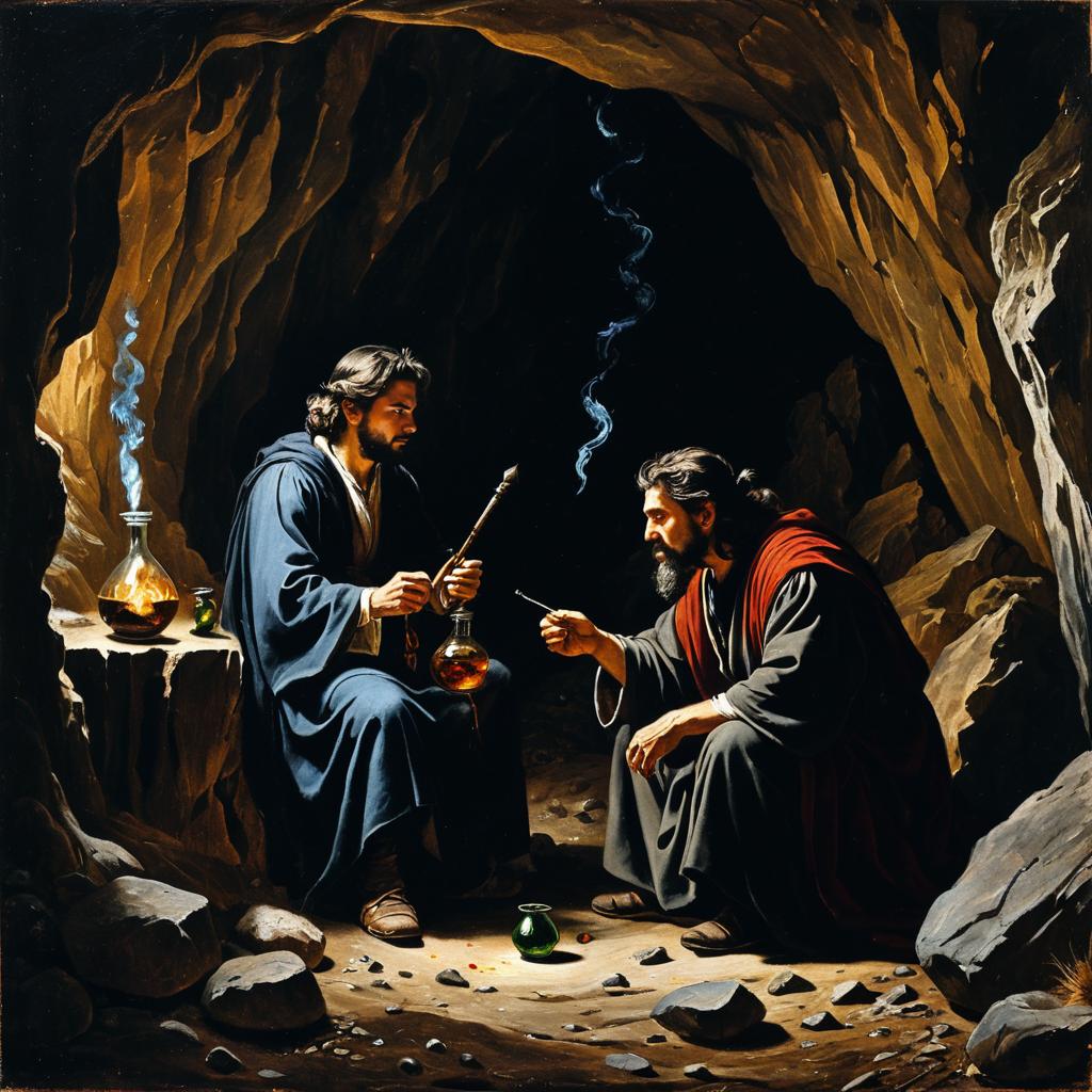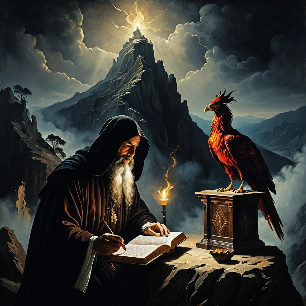 A dramatic painting inspired by Caravaggio style featuring a mysterious sorcerer with a long white beard and dark hooded robe reading a glowing ancient book by torchlight. Beside him sits a wise, fiery red phoenix perched on an ornate wooden pedestal. The scene is set atop a rugged, misty mountain peak with dark clouds and radiant light illuminating the mysterious atmosphere.