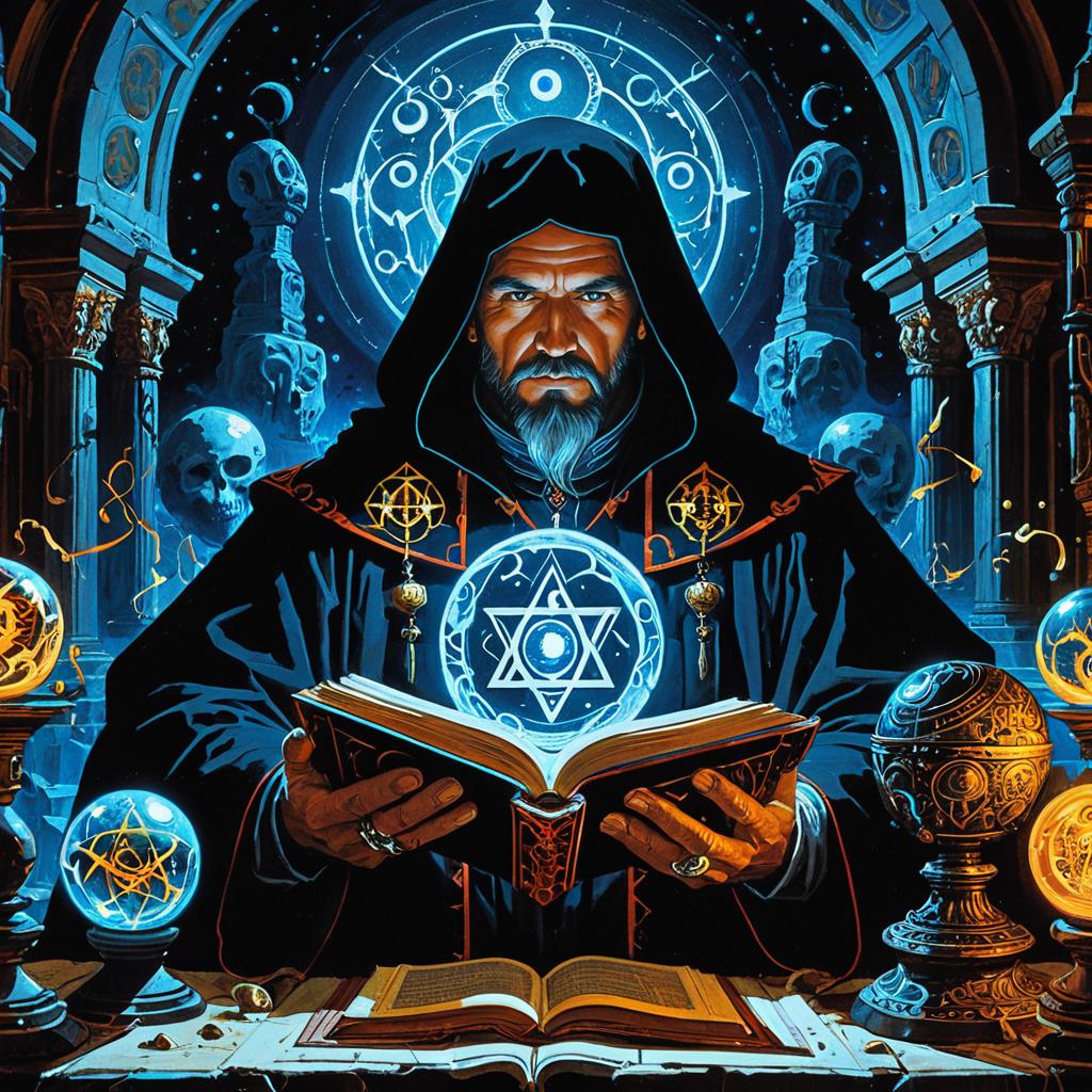 A painting of a mysterious sorcerer and a wise phoenix with a glowing ancient book in a misty mountain peak, by Caravaggio.