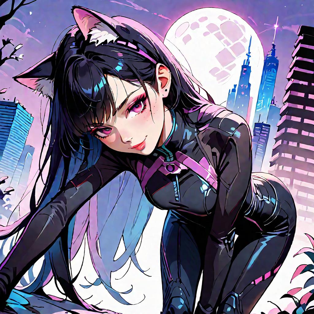 Digital anime-style artwork of a cat-eared girl with black and white hair, green eyes, purple bows, and a frilled dress, leaning forward