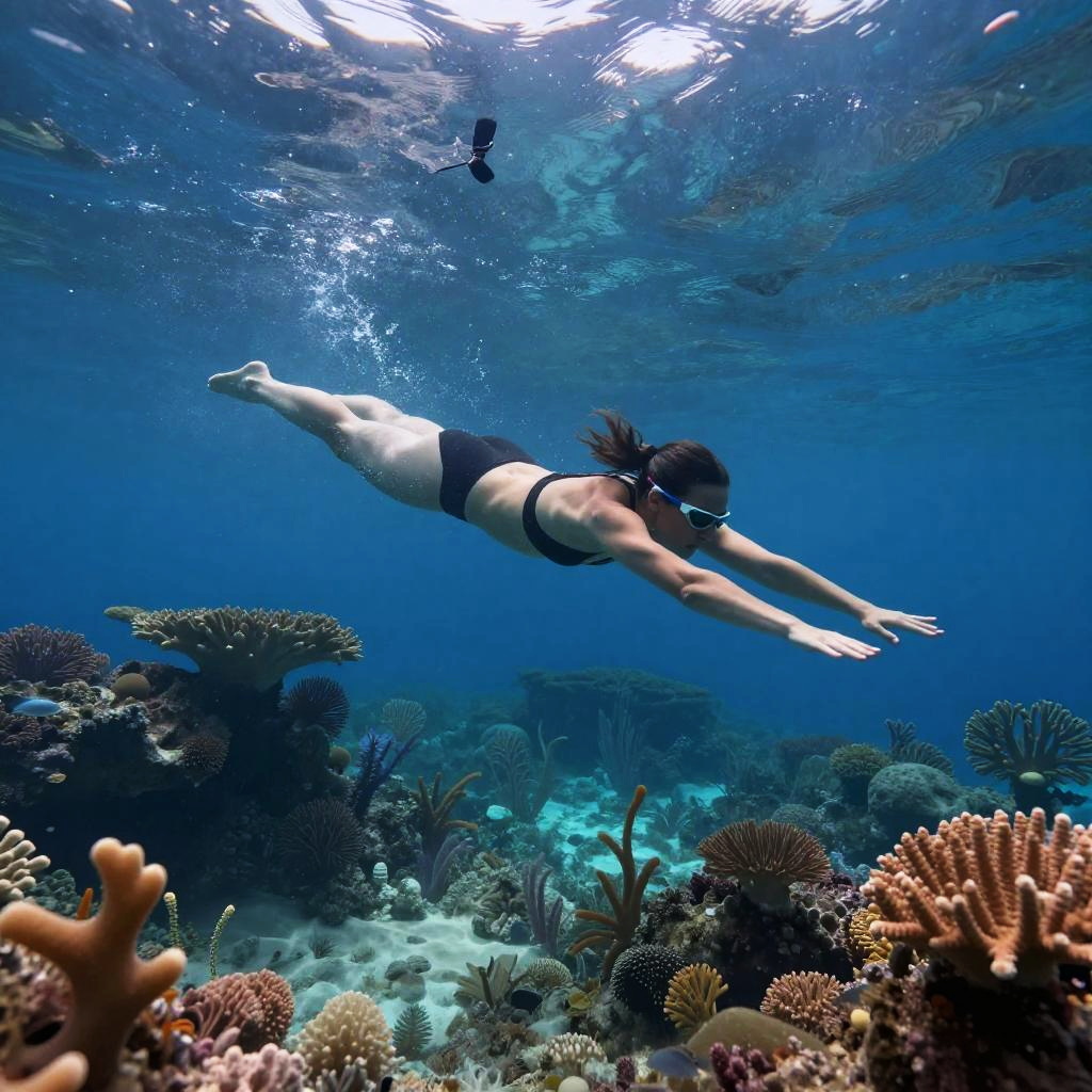 Quastenflosser swimming gracefully in a deep blue prehistoric ocean, surrounded by ancient coral reefs and mysterious aquatic plants, illuminated by soft rays of sunlight piercing through the water, highly detailed and photorealistic.