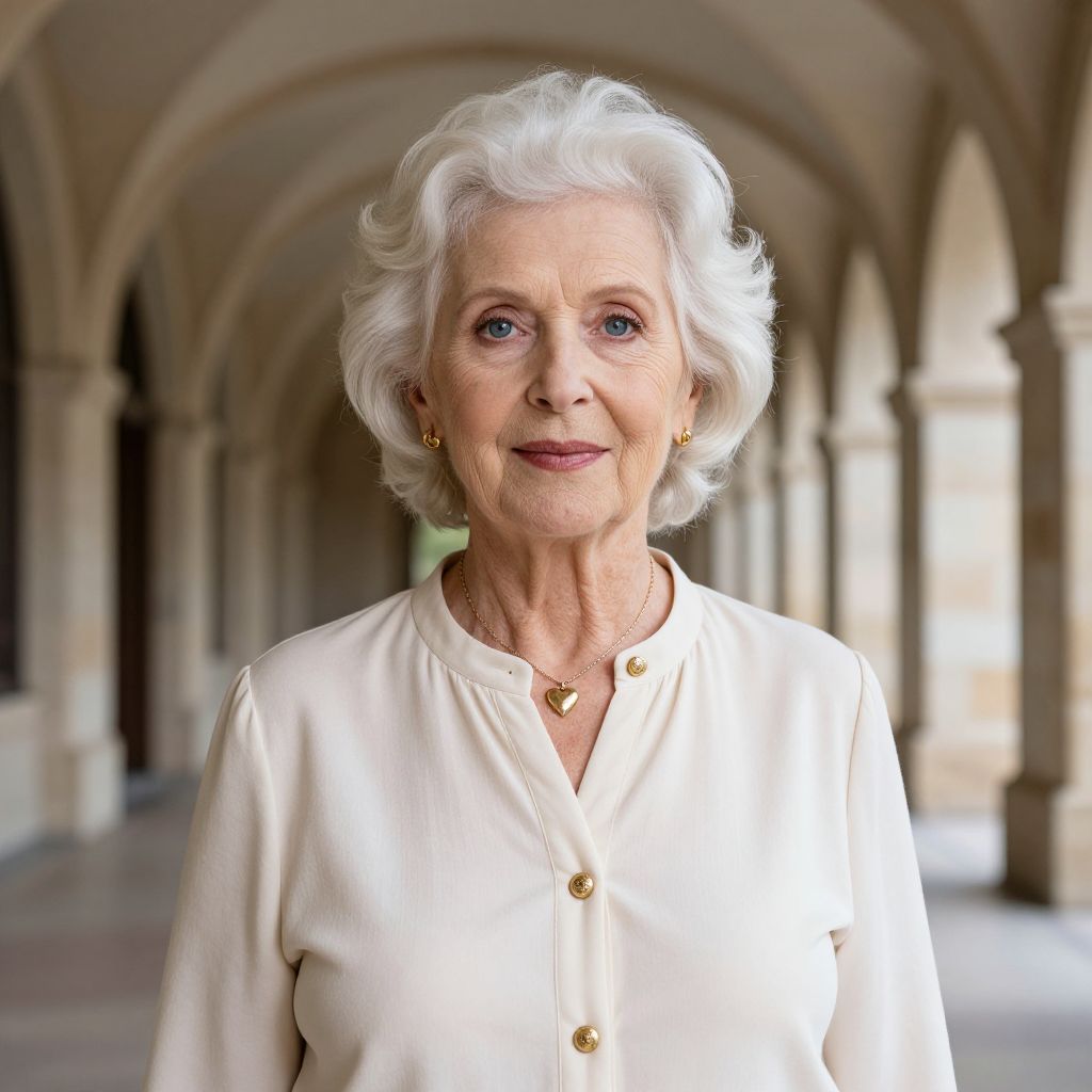 Elderly woman with striking blue eyes and voluminous white hair stands gracefully in an arched stone corridor, adorned in a cream-colored blouse with gold buttons and a delicate necklace featuring a heart-shaped pendant.