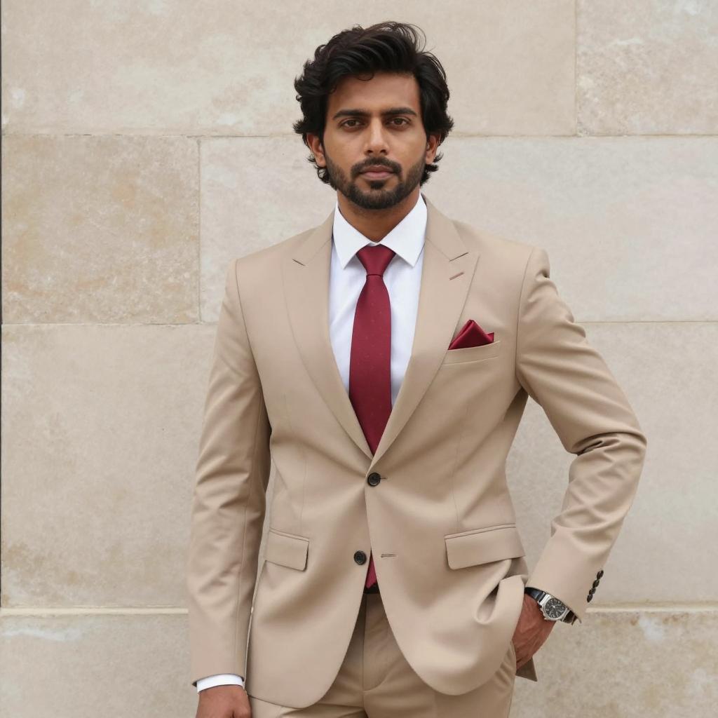 Haldi clothes groom, photograph of handsome Indian man with medium-dark skin tone, black wavy hair, beard, wearing bright yellow traditional kurta with brown stole draped over shoulder, standing in colorful garden with pink and red flowers in background, sunlight filtering through trees, daytime, focused expression, casual pose, medium shot, slight bokeh effect, realistic style, natural light, outdoor setting