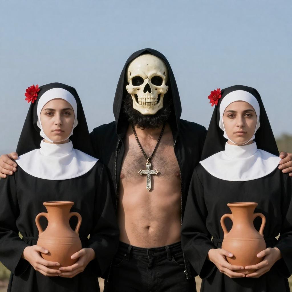 Photograph of three people outdoors. Central male with dark beard, black hooded jacket, chest hair, wearing skull mask, large cross necklace. Two females in black nun outfits, red flowers in hair, holding clay pots. Blue sky background. Central male's hands on females' shoulders. All expressions neutral.