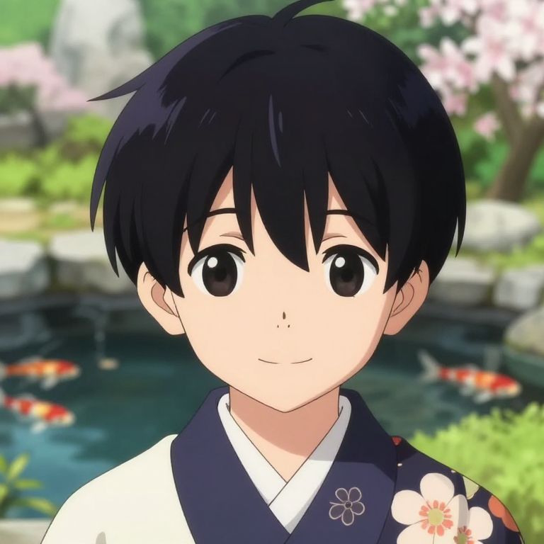 Cute anime boy hair featuring sleek, glossy black locks with side bangs framing his face, gentle smile, soft lighting, wearing a traditional kimono with floral patterns, serene garden background with koi pond and blooming flowers.