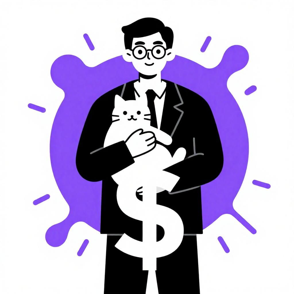 Drawing of a man with dark hair, glasses, and a black suit holding a cat. He stands to the right, purple splatter behind him. Large white dollar sign overlaps the lower half. Minimalistic style.