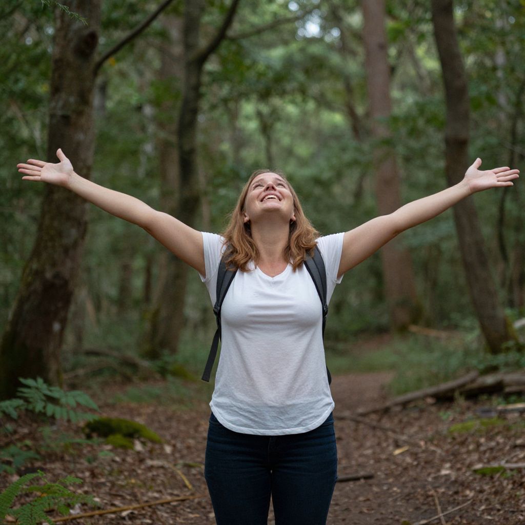 Photograph of a smiling, fair-skinned woman with shoulder-length brown hair, wearing a white t-shirt, black jeans, and a black backpack. She stands with arms outstretched in a forest, surrounded by tall trees with green leaves and a dirt path beneath her. The background is lush and green, with moss-covered ground and ferns. The woman's expression is joyful, and she is looking upwards, basking in the natural light filtering through the trees. The image has a vibrant, natural color palette and a slightly blurred background, emphasizing the woman in the foreground.