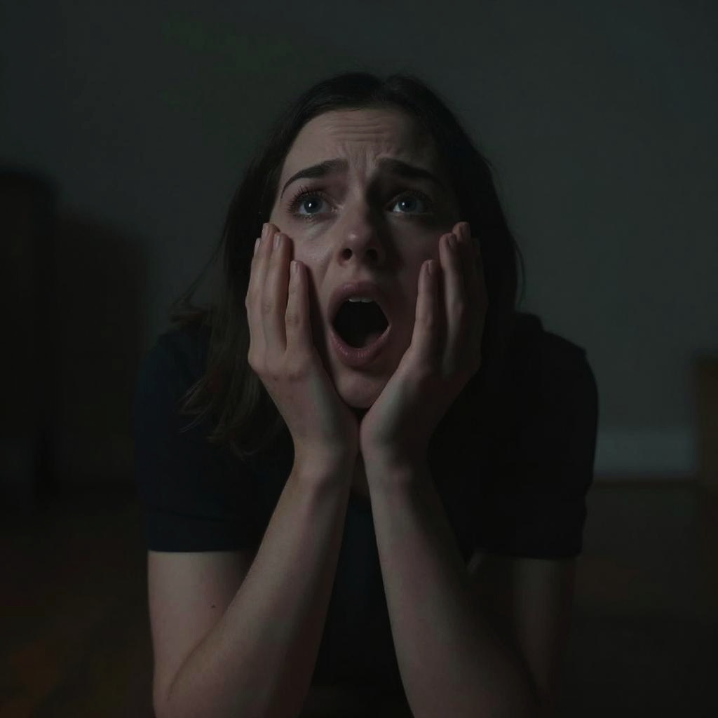 On knees mouth open, dramatic low-angle portrait of a person in dim light, expressing awe and vulnerability, cinematic shadows, detailed facial features, intense emotional atmosphere