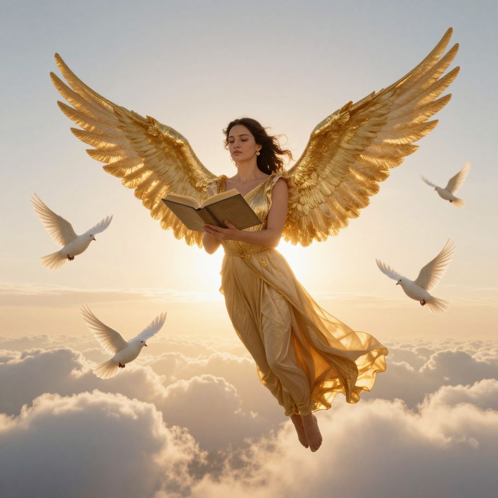 A woman with expansive golden wings gracefully soars above the clouds, holding an open book while surrounded by four flying doves, bathed in the warm glow of a setting sun.