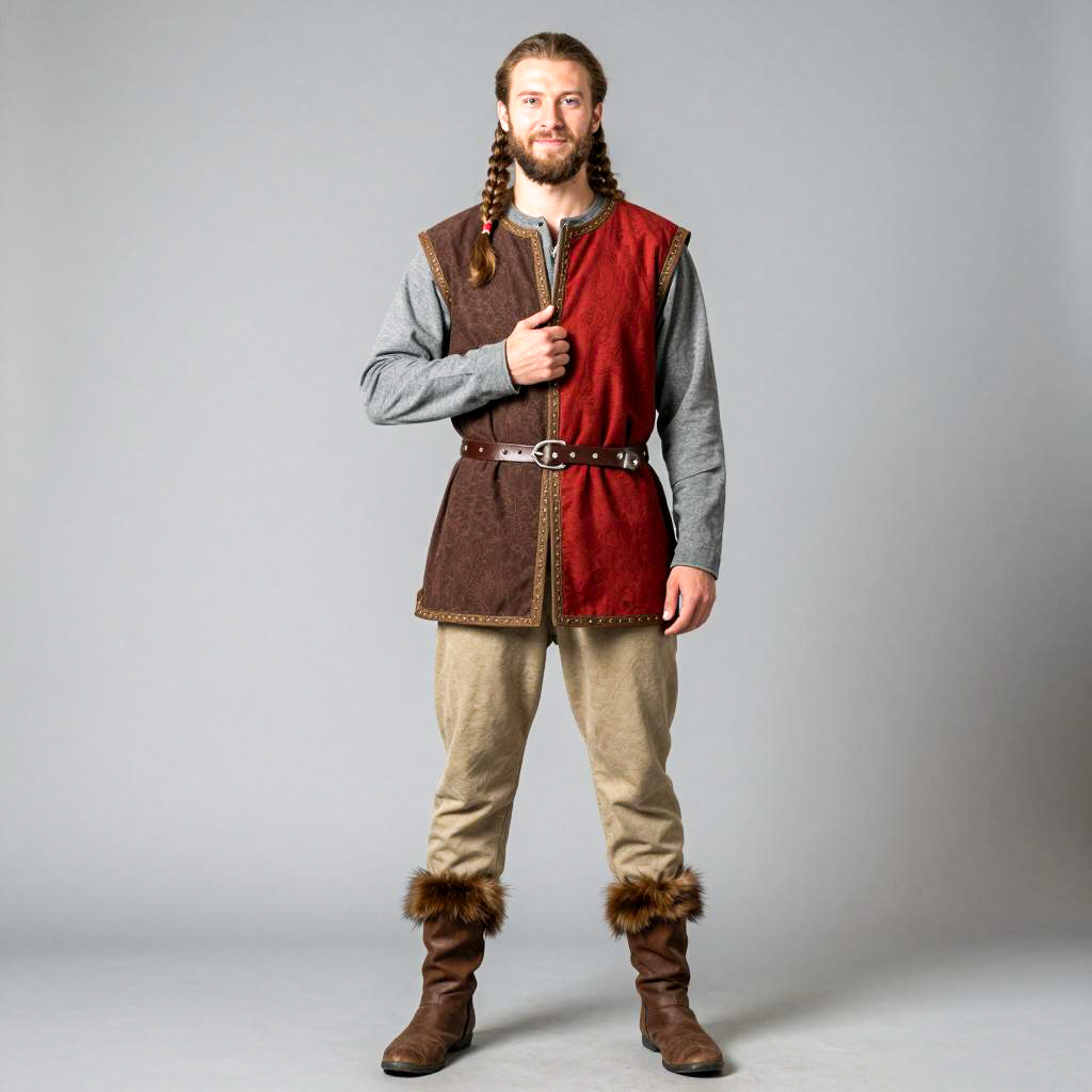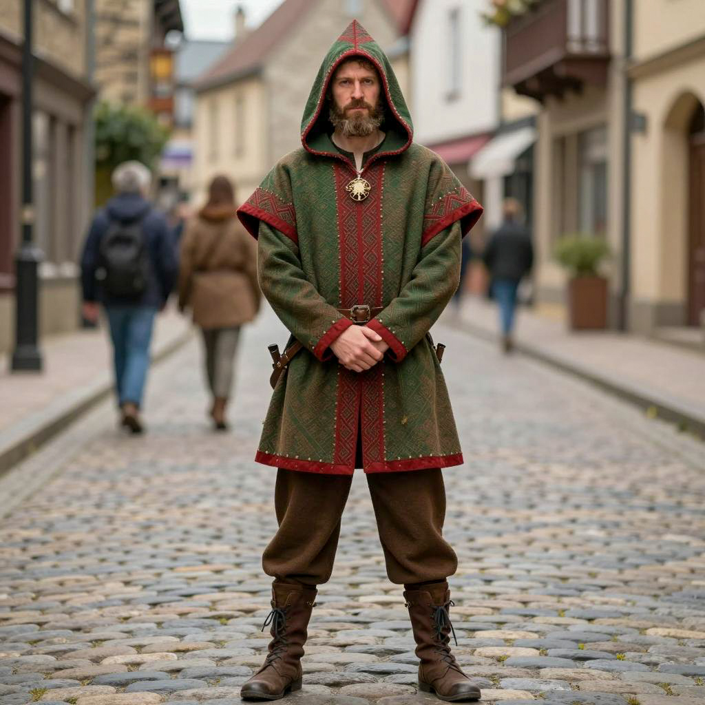 Gimli costume, photorealistic medieval man, standing in a cobblestone street, hooded green and red patterned tunic, brown pants, red cuffs, brown boots with laces, holding hands together, beard, serious expression, blurred background with people and buildings, daytime, natural light, soft focus, fantasy, historical costume, detailed ures, outdoor setting, town street, medieval fashion, traditional clothing, immersive atmosphere