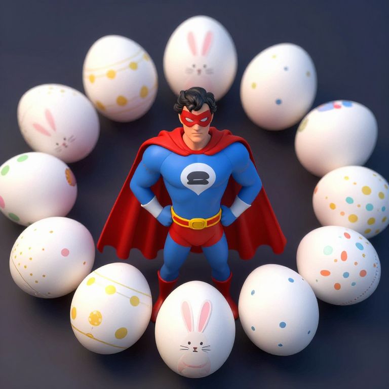 Photograph of a Superhero action figure standing confidently at the center of a circle of 12 white eggs with various colorful doodles. The figure has a muscular build, blue suit with a yellow belt, red cape, and a red mask covering his eyes. His black hair is styled in waves. The eggs are scattered uniformly around him against a dark blue background, creating a stark contrast with the figure's bright colors. The eggs display playful, hand-drawn patterns like flowers, stars, and smiley faces. The image is brightly lit, highlighting the vivid colors and textures of both the figure and the eggs.