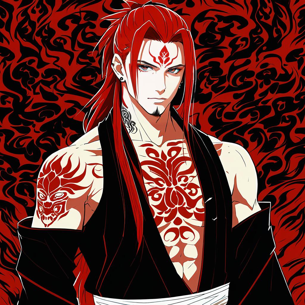 Digital anime illustration of a male character with long red hair tied in a ponytail, detailed red tribal tattoos on chest, forehead, and left shoulder, wearing a black kimono with sleeves partially off. The background features swirling black and red patterns that complement the character's intense expression. Style inspired by the artist Uranaishi (Miraura).