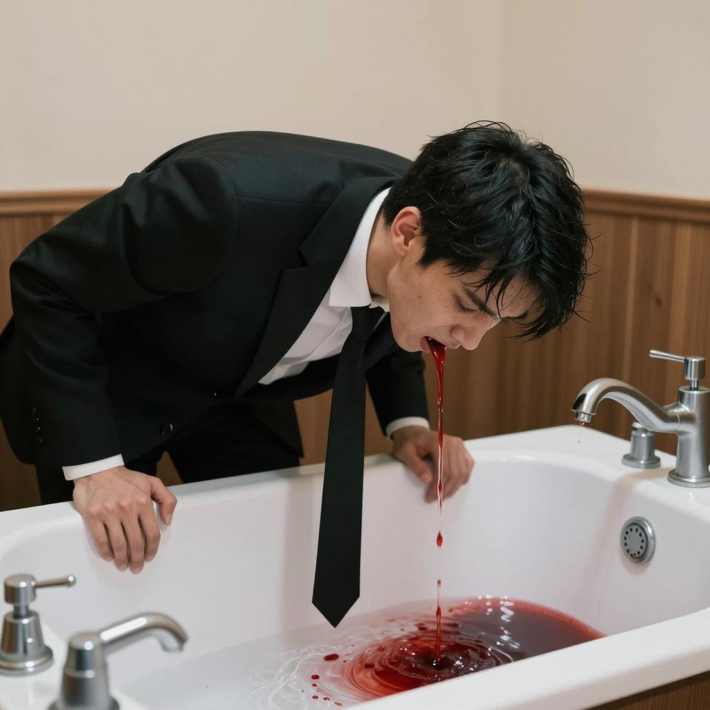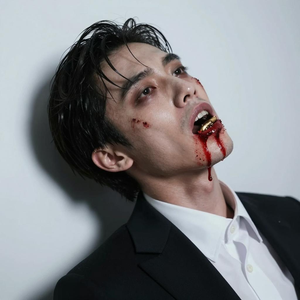 Man with pale skin, dark wet hair, and blood-covered face, has a golden object forced into his mouth, blood dripping down. He is leaning against a white wall, eyes wide and slightly upward. Wearing a black suit and white shirt.