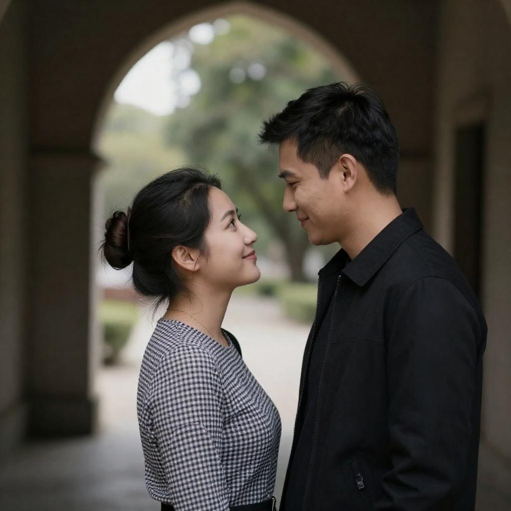 Photograph of a couple in formal attire, facing each other closely. The man, with dark hair and a white military-style uniform, gazes at the woman. She has short brown hair, wears a white hat adorned with pearls, and a white coat with a high collar. They are outdoors, with a blurred background of rail tracks and indistinct lights.