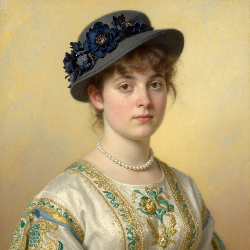 Photograph-style painting of a young Caucasian woman with fair skin, brown hair, wearing a black hat with blue flowers, white pearl necklace, and gold