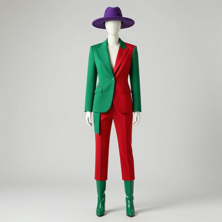 Mannequin wearing a green and red outfit with a green hat and a red scarf.