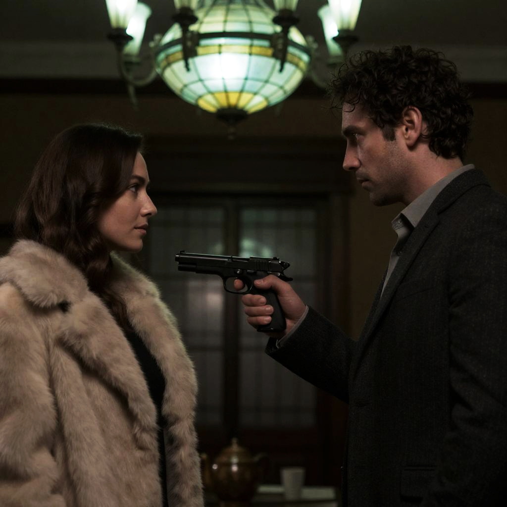 Photograph of two people in a dimly lit room. Man on right, holding gun, points at woman on left. Woman, with brown hair, fur coat, calm expression. Man, with curly hair, intense expression. Green stained glass chandelier in background.
