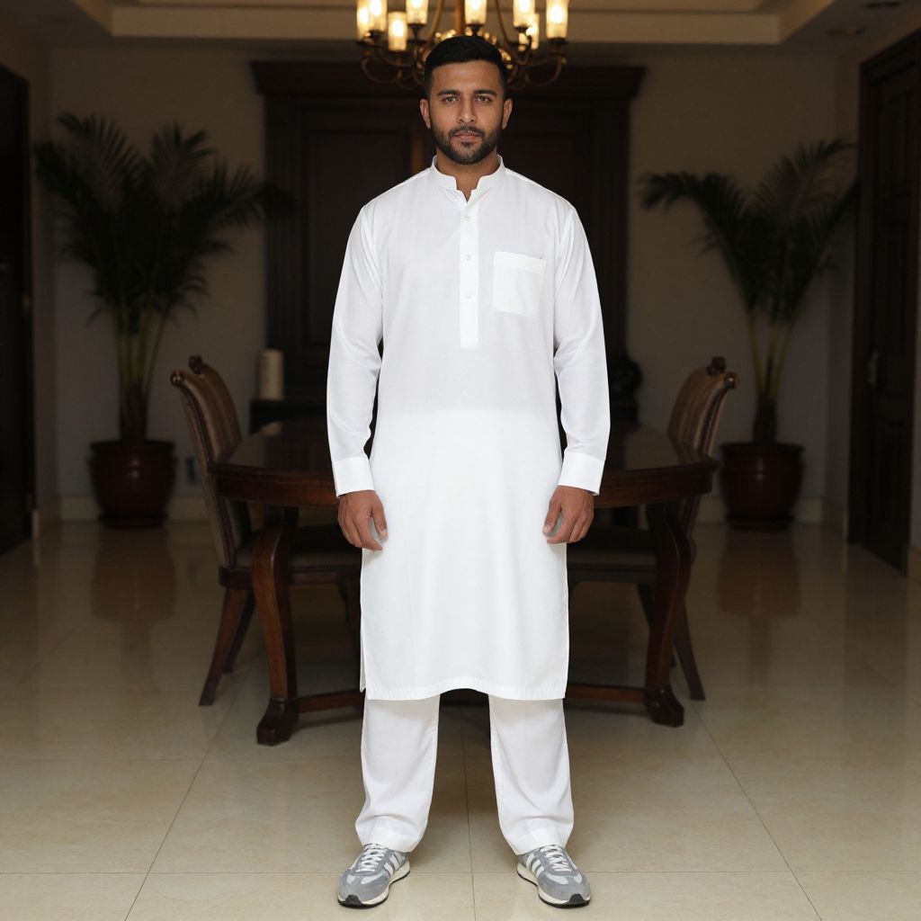Photograph of a handsome man standing in a dimly lit room. He has short black hair, a trimmed beard, and is wearing a crisp white traditional long-sleeve shirt and pants, with grey and white sneakers. He's looking directly at the camera with a neutral expression. The background features a chandelier, potted plants, and a dark wooden table. The floor is tiled in a light beige color.
