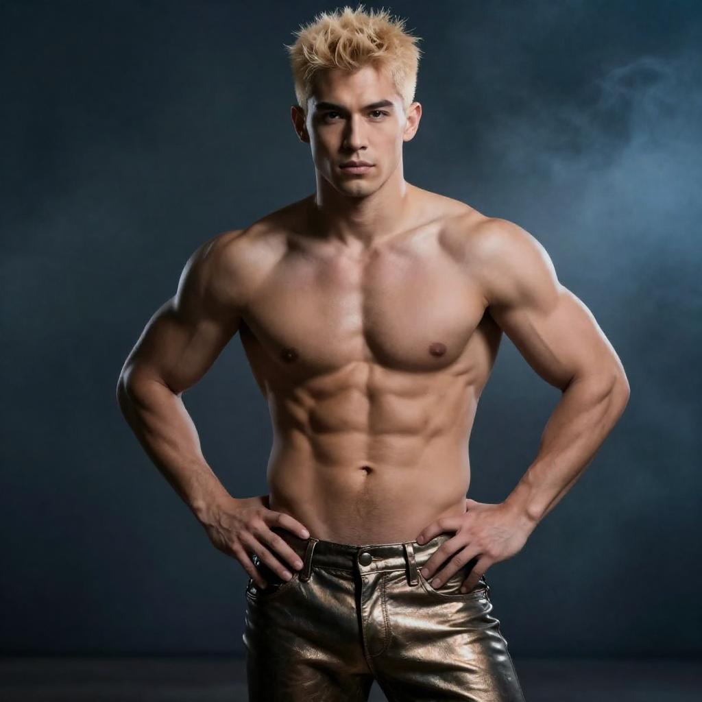 Photograph of a muscular, shirtless man with short, spiky blonde hair and light skin. He wears dark, metallic, low-rise pants with a belt. He stands confidently with hands on hips, set against a smoky, blue-lit background. His defined abs and chest are prominently displayed.