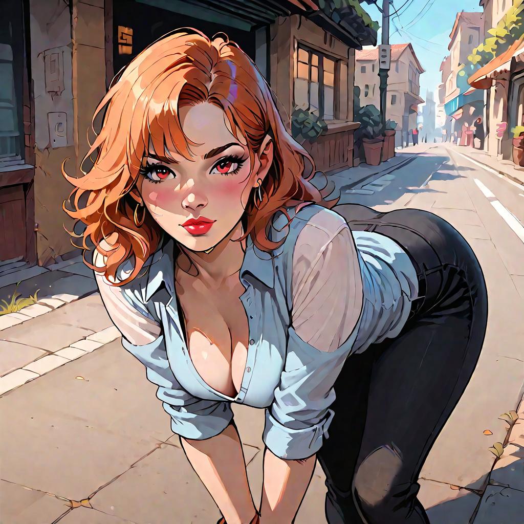 Score_9, score_8_up, score_7_up, score_6_up, score_5_up, score_4_up, street, female Naruko, solo, clothed, shy, bent over, looking at viewer, cleavage