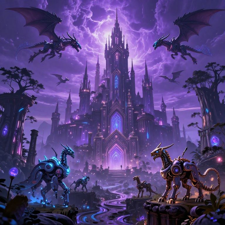 Ai.fantasy landscape with futuristic castles and neon forests under a glowing purple sky, featuring robotic dragons soaring above and enchanted mechanical creatures wandering mystical ruins, in ultra-detailed digital art style.