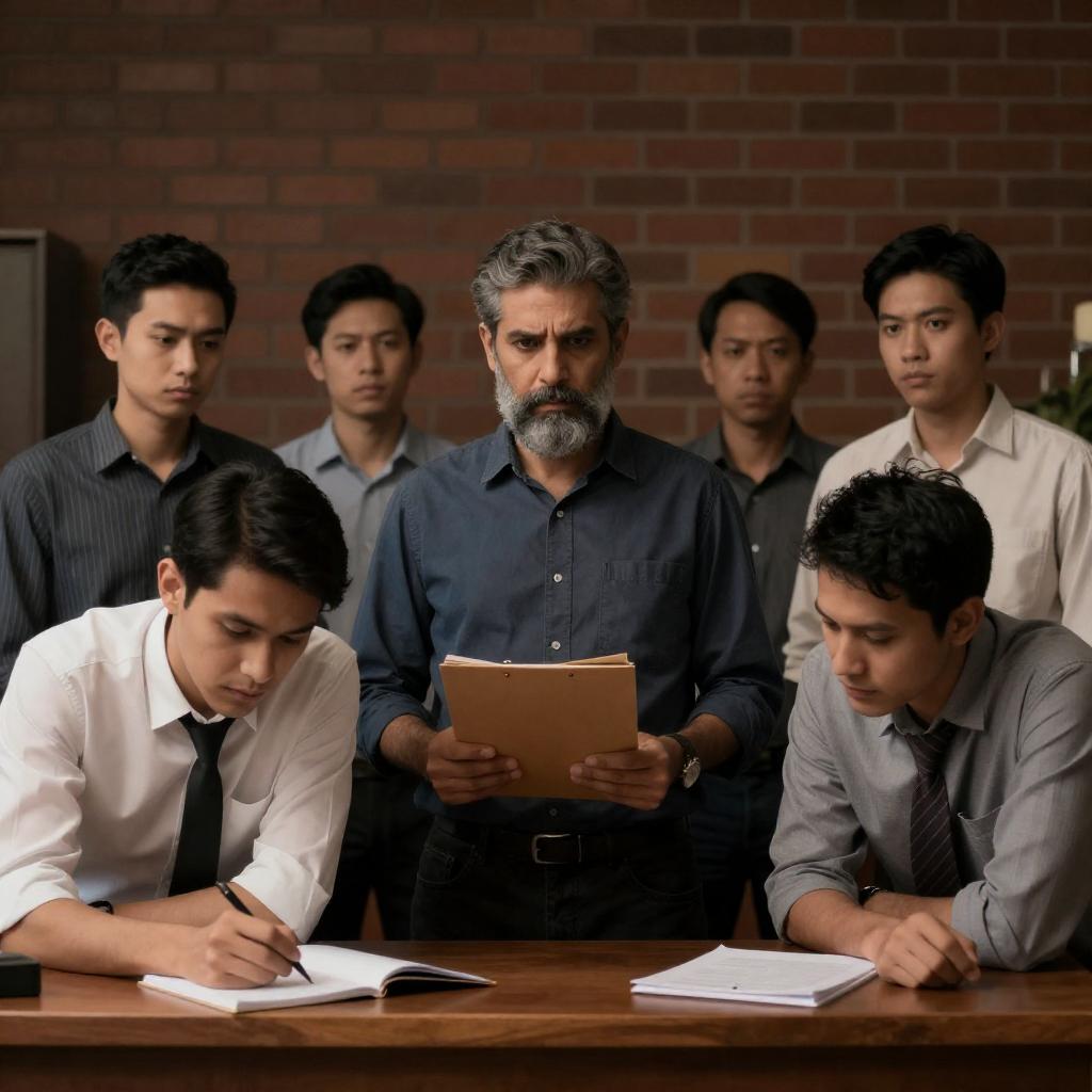 Photograph of six young men sitting on a chain-link fence. They have short to medium-length hair, wearing casual clothes. The men are in a row, leaning slightly forward, looking intently at something off-screen. Background is dark. The man on the far left wears a yellow shirt, others in various colors. The fence is on the right. The men have serious, focused expressions.