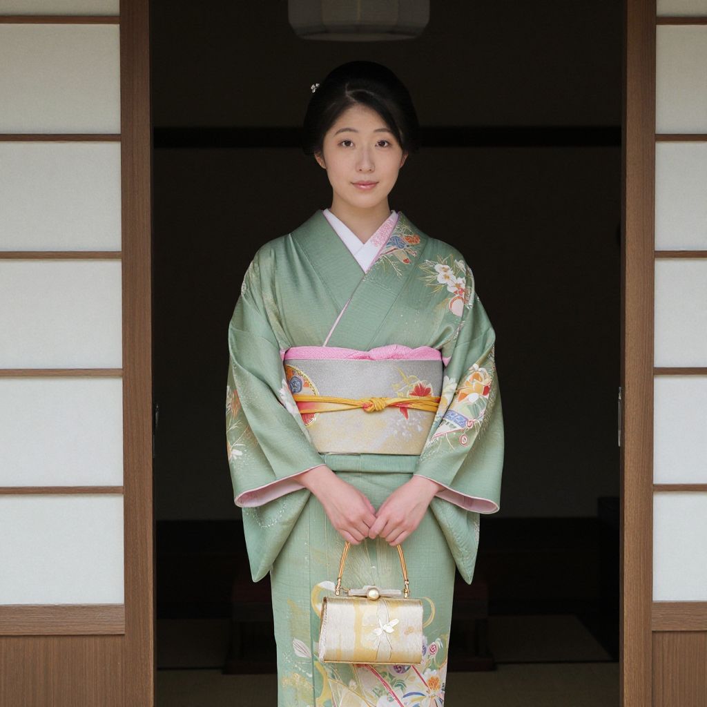 Photograph of an East Asian woman in a green, floral kimono, holding a small, patterned handbag, standing in a traditional Japanese doorway