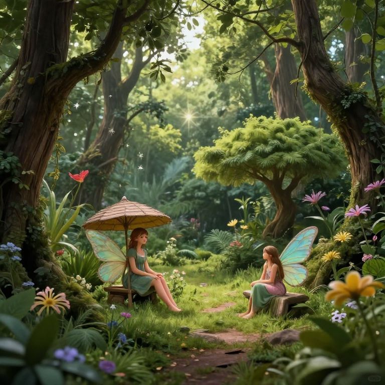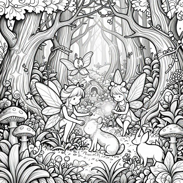 Enchanted forest fairy garden coloring pages illustrating magical fairies tending to glowing plants and fungi in a lush forest filled with twisted branches, hidden nooks, fairy lights, and playful woodland animals, designed with elaborate linework for coloring fun.