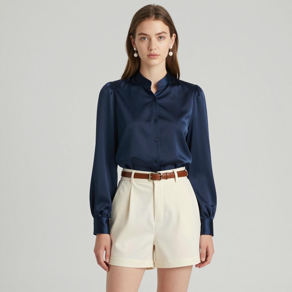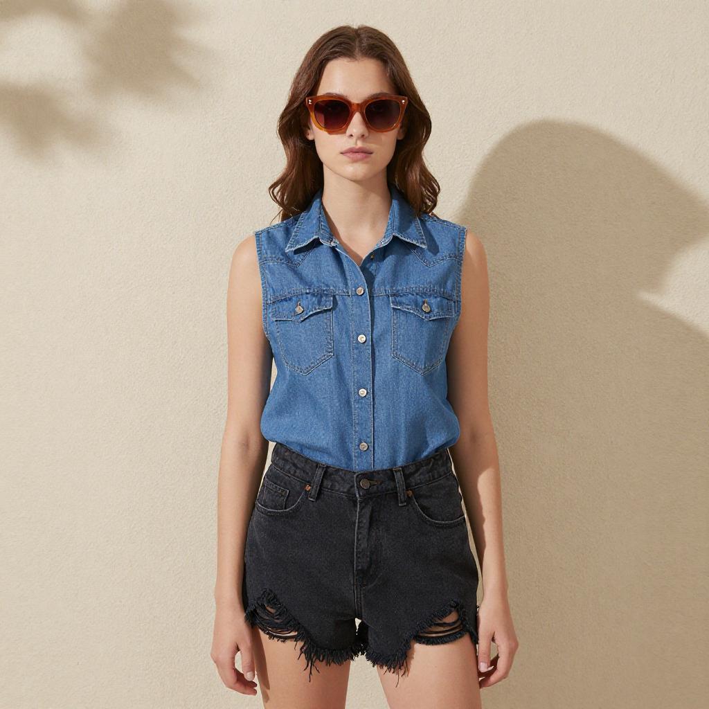 Portrait of a young woman wearing a sleeveless blue denim shirt with front pockets and button fastening, paired with black distressed denim shorts with frayed hems. She is also wearing stylish amber-tinted sunglasses, standing against a textured beige wall with sunlight casting shadows.