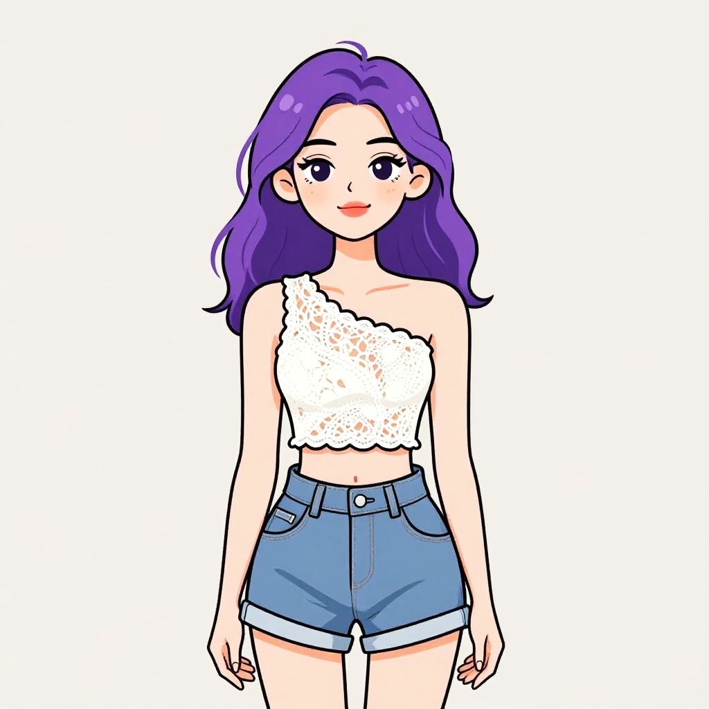 Woman with pretty face and pretty hair. smiling Woman, casual chic, light pink camisole with lace trim, thin spaghetti straps, scoop neckline, tucked into high-waisted dark blue denim shorts, zipper front, pockets, silver delicate necklace, ring accessories, plain white studio background. --sref 1467