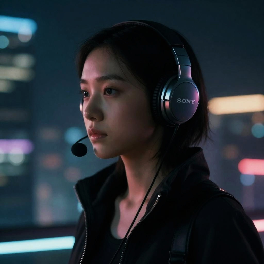 Cinematic film still, photo of a girl, cyberpunk, neonpunk, headset, city at night, sony fe 12-24mm f/2.8 gm, close up, 32k uhd, wallpaper, analog film grain