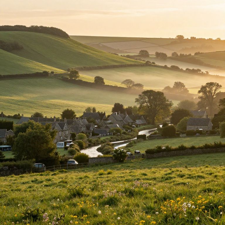 Inglaterra countryside at golden hour, rolling green hills, ancient stone cottages, winding rivers, soft mist over fields, vibrant wildflowers, a peaceful rural scene with a gentle breeze, ultra-realistic style, warm pastel colors, high detail