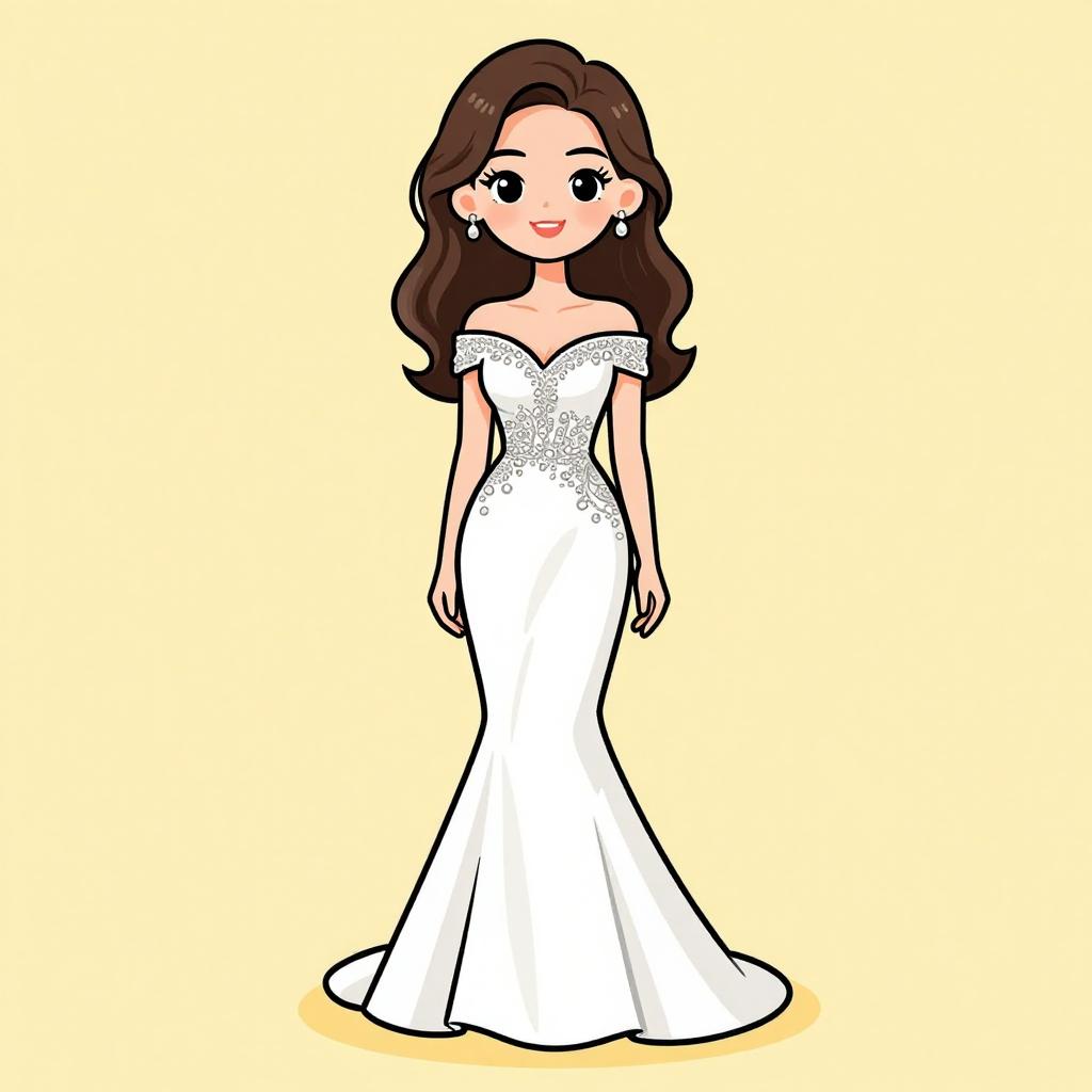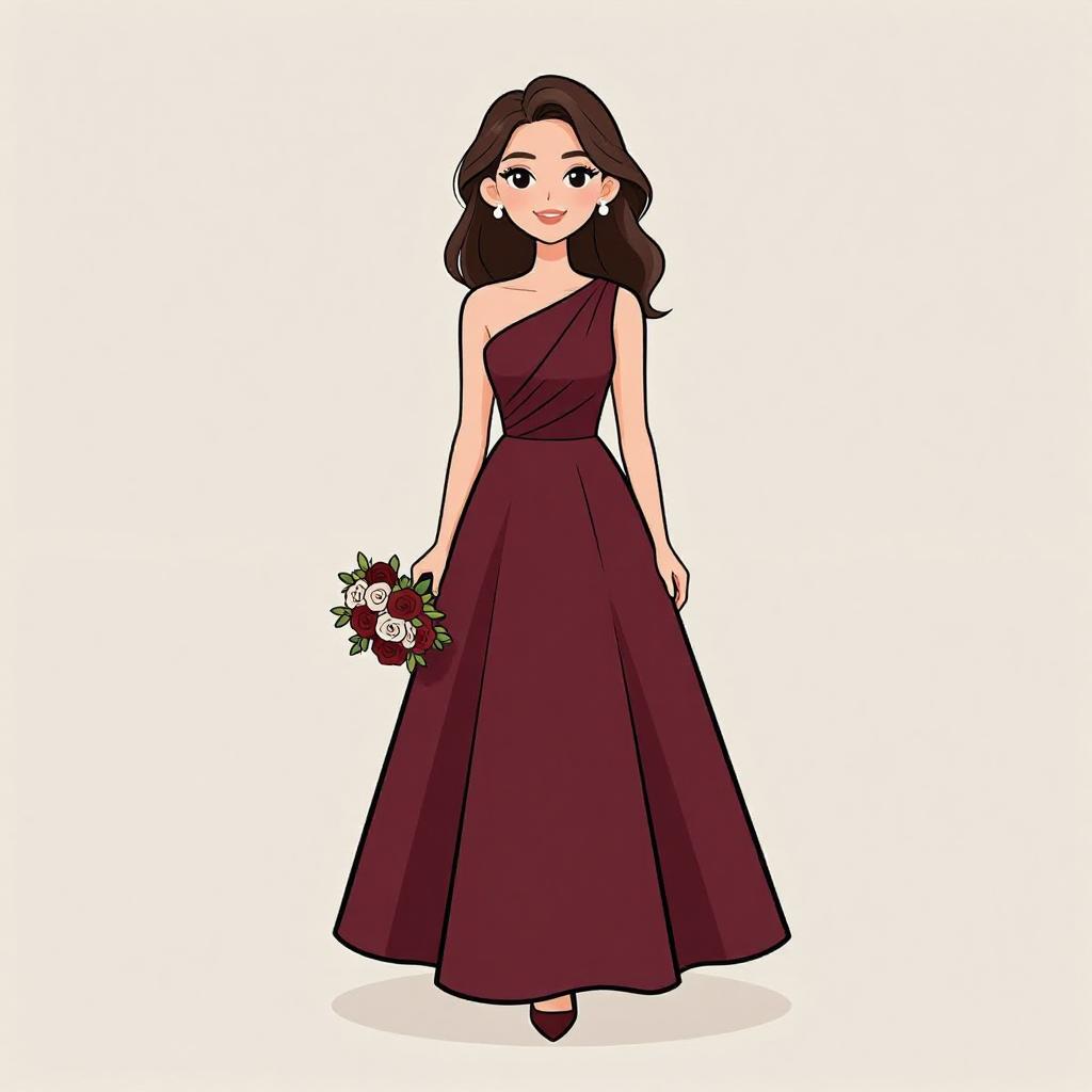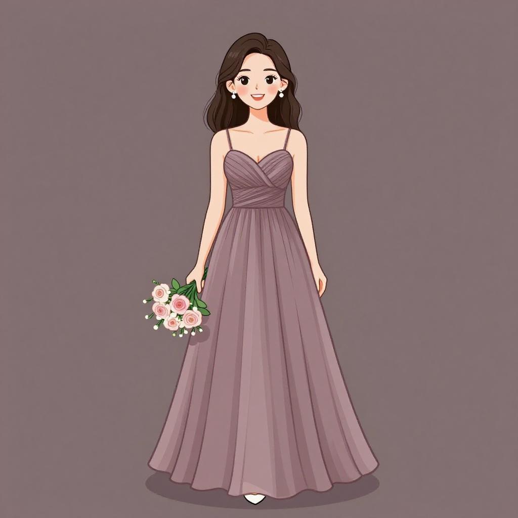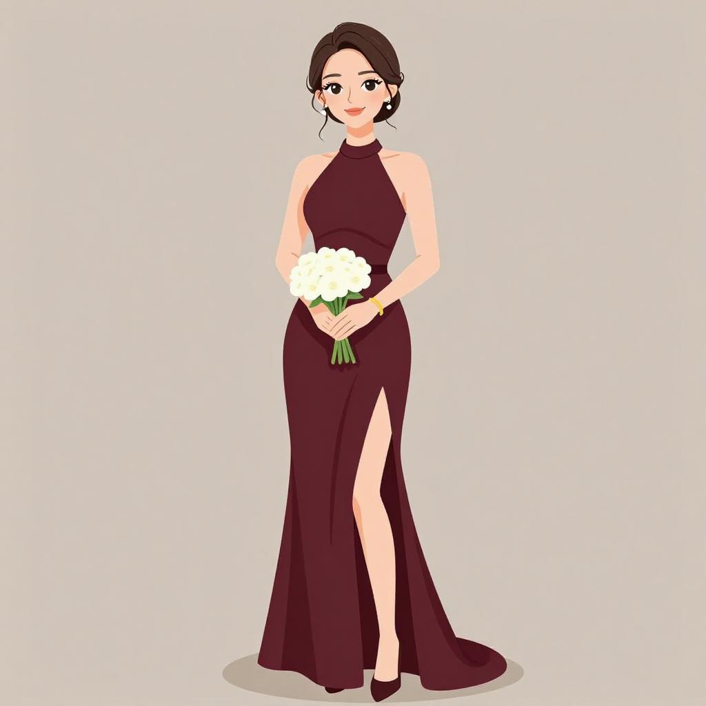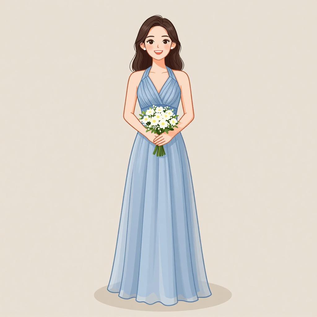 Woman with pretty face and pretty hair. smiling Woman, romantic bridesmaid, chiffon maxi dress in soft blue, sleeveless, halter neckline with ruched detailing, fitted pleated bodice, flowing floor-length skirt, holds a small bouquet of white flowers, studio backdrop in beige neutral tone --sref 1467