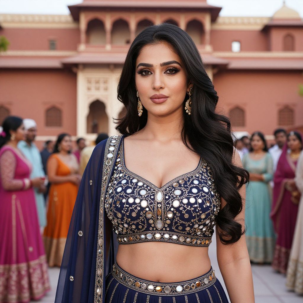 A glamorous woman with long black hair and a soft, determined expression, wearing a luxurious navy ghagra suit with intricate mirror work, standing in front of a traditional haveli house during a wedding ceremony, with guests in colorful traditional attire in the background.. The woman has big breasts and cute face
